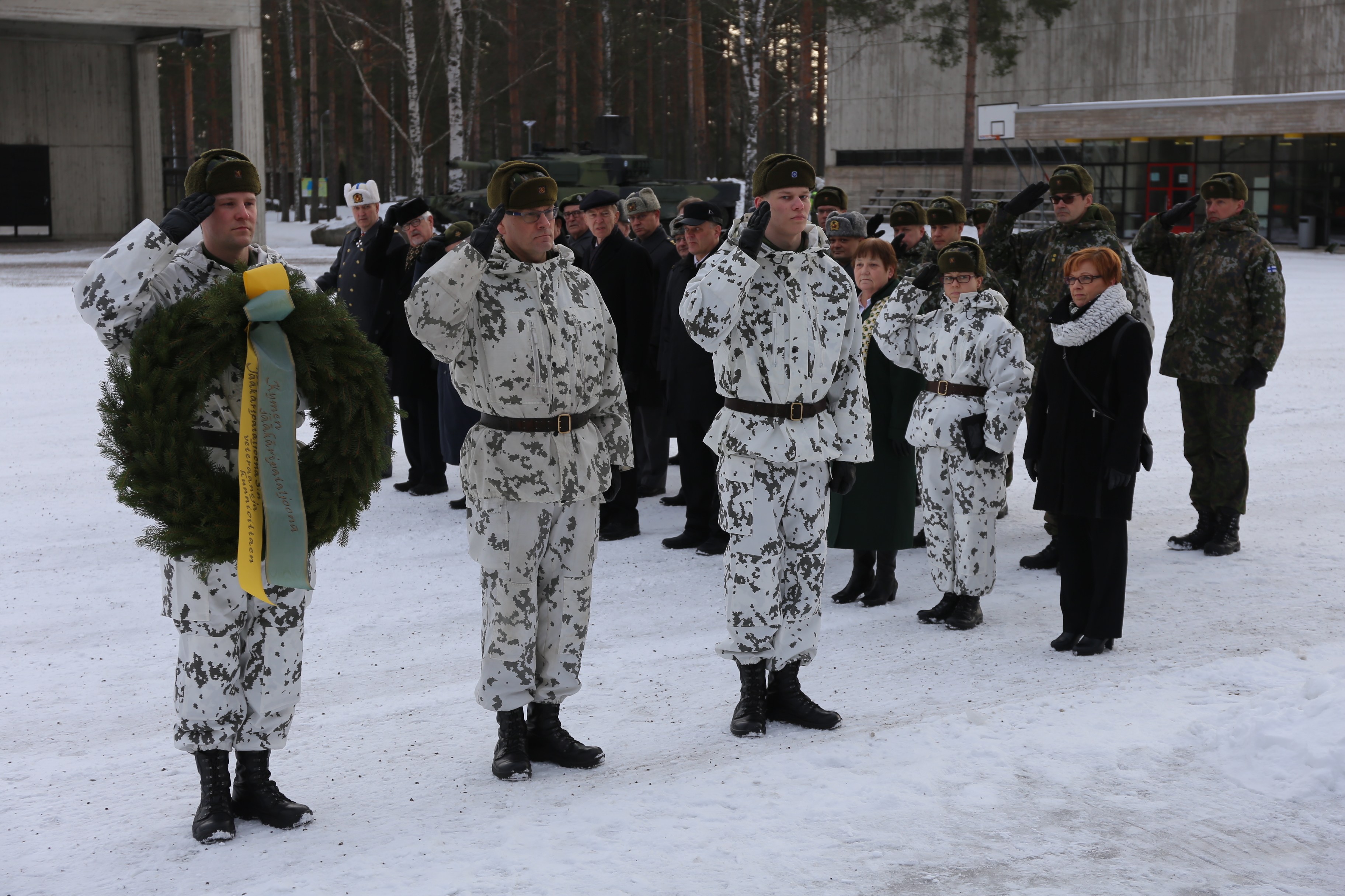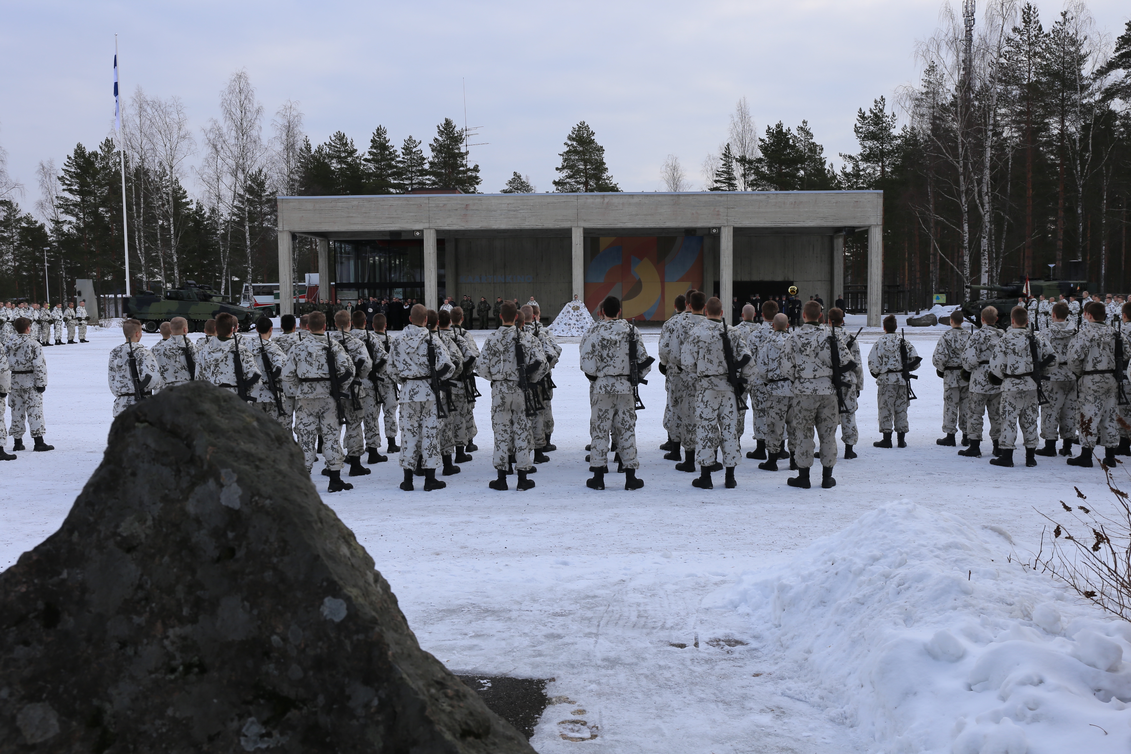 Paraatikatselmus Kaartinaukiolla. Meneillään kenttähartaus. Etualalla JP 3 muistokivi, jolle Kymen jääkäripataljoonan komentaja, everstiluutnantti Jami Virta laski seppeleen.