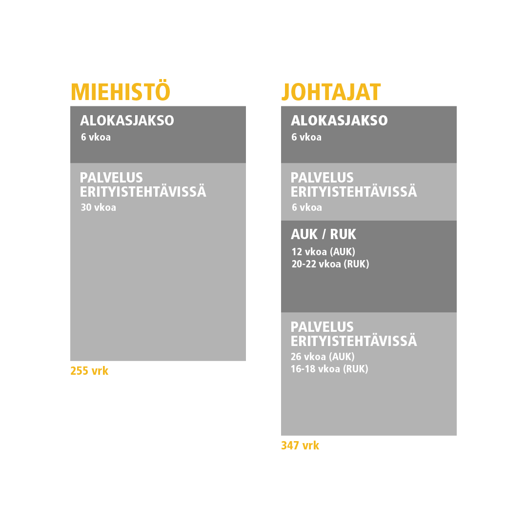 Erityistehtävissä on mahdollista palvella miehistö- ja johtajatehtävissä. Varusmiesjohtajilla palvelusaika on 347 ja miehistöllä 255 vuorokautta. Kaikki varusmiehet suorittavat ensin 6 viikon alokasjakson.