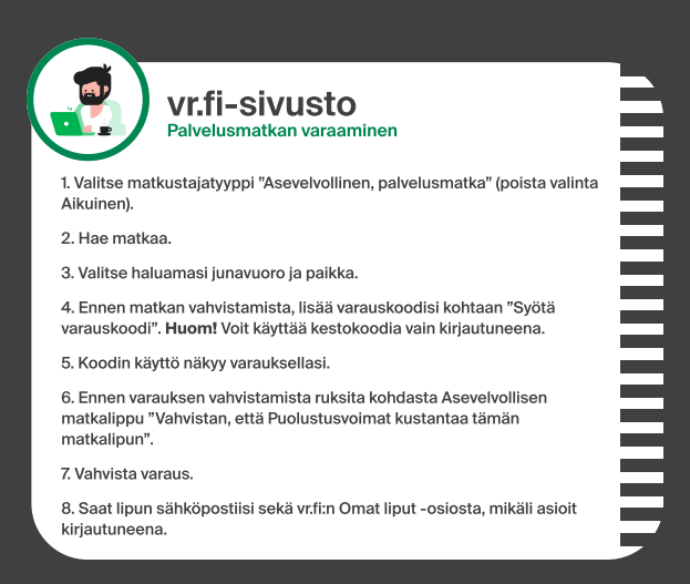 Voit varata itsellesi palvelusmatkan Puolustusvoimilta saamallasi henkilökohtaisella koodilla. Matkavarauksen voit tehdä joko vr.fi-sivustolla tai VR Matkalla -sovelluksessa.